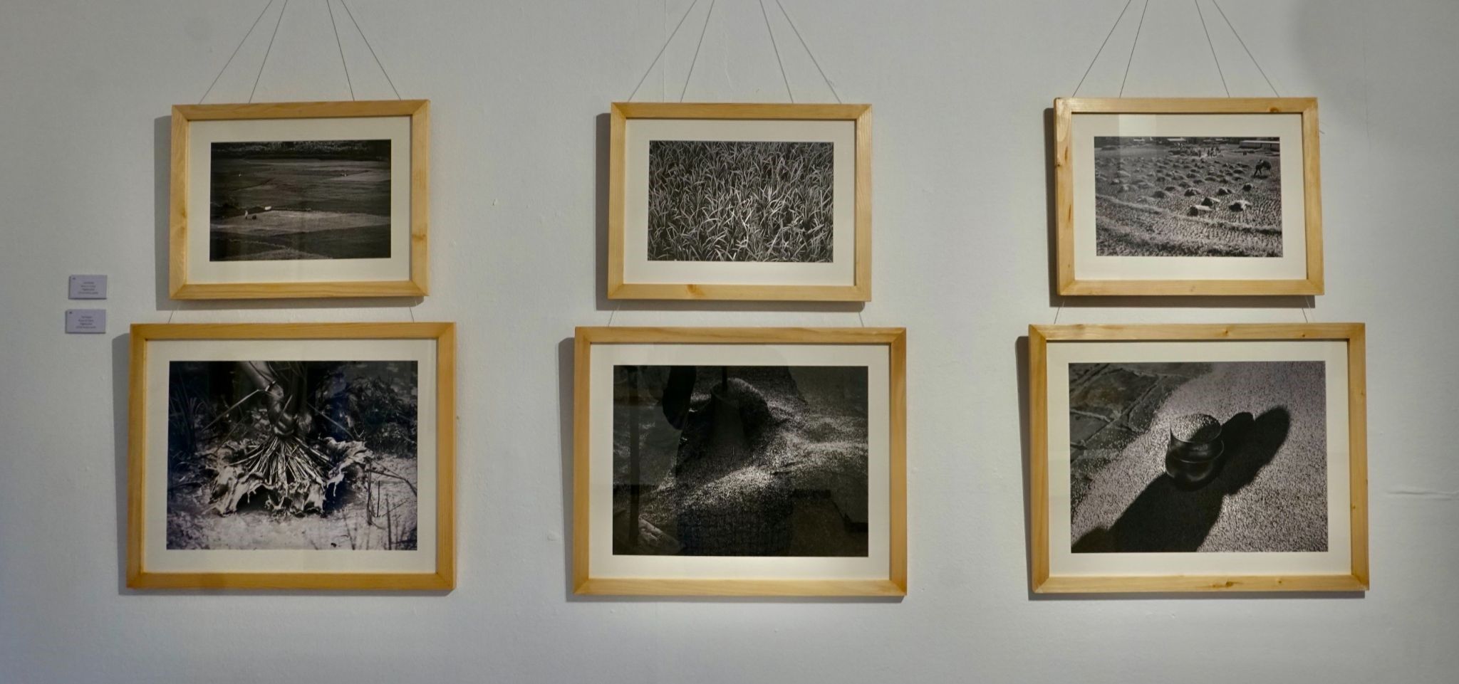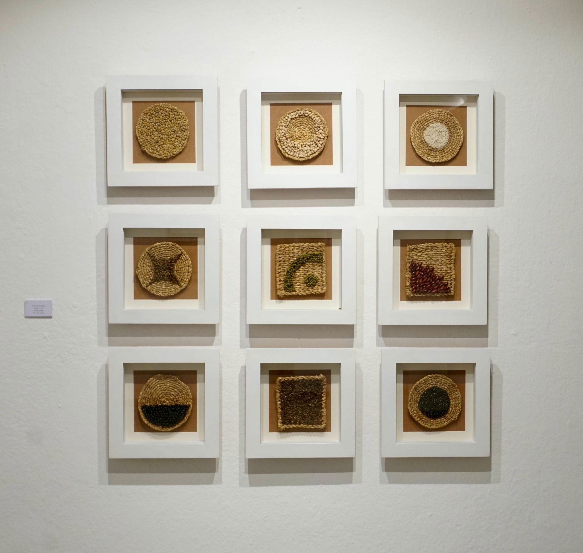 The exhibit includes nine pieces of work, each featuring circular or square rice-staw bases above which different types of seeds are creatively placed. Grains of rice, kidney beans, black sesame, and soybeans are placed gracefully in different patterns. These seeds are grown extensively in the valley and are used frequently in Nepalese households.