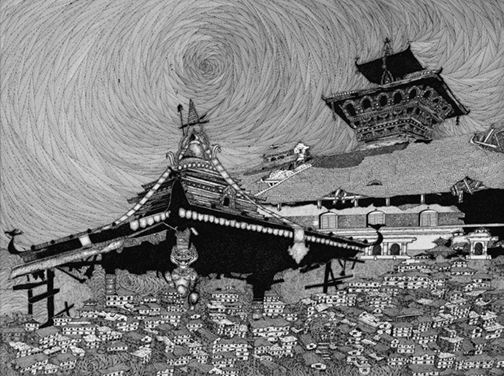 Sujan Dangol’s Kathmandu is dreamy. It is mystical. Kalki—one of the avatars of Lord Vishnu—flies over it. The Baraha is shown to be balancing it on his head. The temples and chaityas seem to be inhabited by spirits. His Kathmandu is more than a concrete jungle, it is a place for gods.
