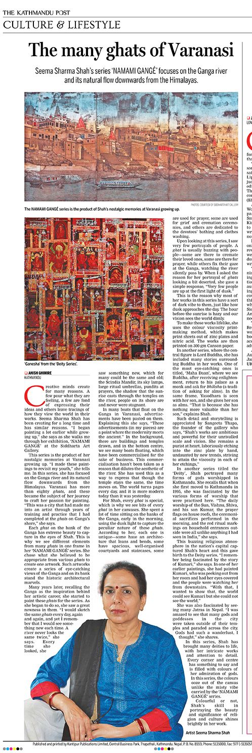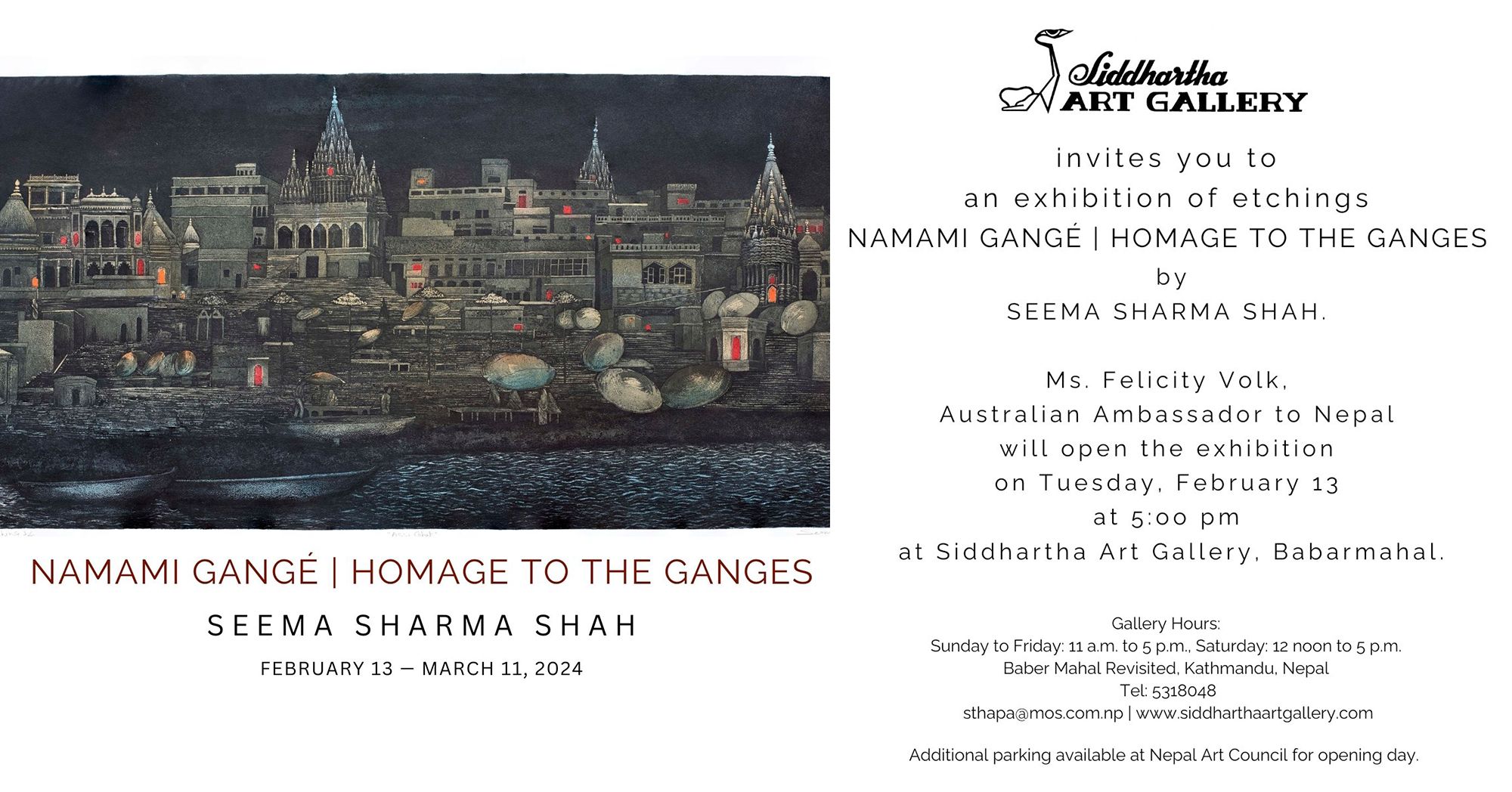 The series Namame Gange by the printmaker Seema Sharma Shah marks her seventeenth solo exhibition and the seventh one at the Siddhartha Art Gallery. With this exhibition, Seema pays homage to Varanasi, the city where she was born, where she received formal academic training and where she met the love of her life—a fellow student—the Nepali artist Uma Shankar Shah, whom she married in April 1995. The marriage of these two artists is also a marriage of two cultures. No other city in India has closer spiritual ties to Nepal than this holy city on the banks of the Ganges. Varanasi and Kathmandu which are sister cities, celebrate the Shaivaite link or sacred geography between Kashi Vishwanath in India and Pashupatinath in Nepal. It is, therefore, not surprising that Seema’s work has always been imbued with the feeling of reverence and piety. In the process of creating her works, she becomes the ultimate pilgrim surreptitiously documenting the art and architecture of this magnificent city in chiaroscuro, the deities that are immortalized in stone and metal and the festivals that celebrate the faith of a pious populace.