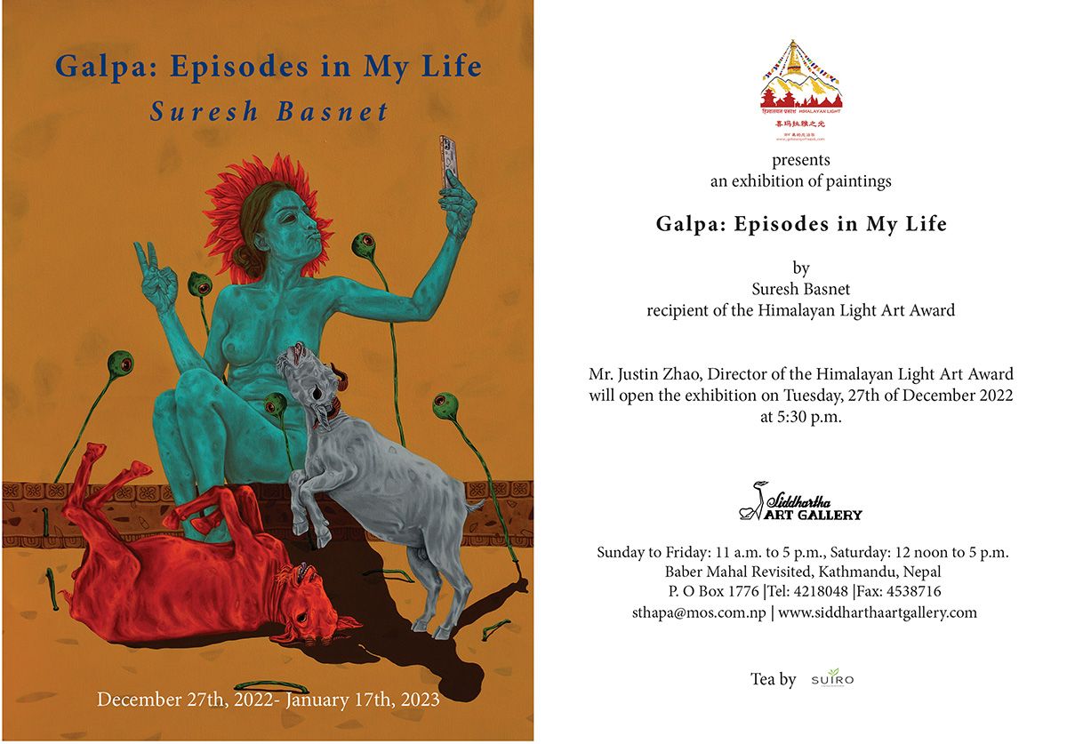 Suresh Basnet’s exhibition “Galpa: Episodes in My Life” is a socio-political narrative about the current state of politics in Nepal. Galpa which translates as ‘narrative’ inspires both reflection and conversations about the blind side of governments. The State itself is represented by a triptych in which a donkey occupies the highest chair of office with the flag of the nation on either side. In the background the artist paints the symbols of the three prominent political parties of Nepal – the mood of the donkey or leader varies from self-content, thoughtful, and plain worried.