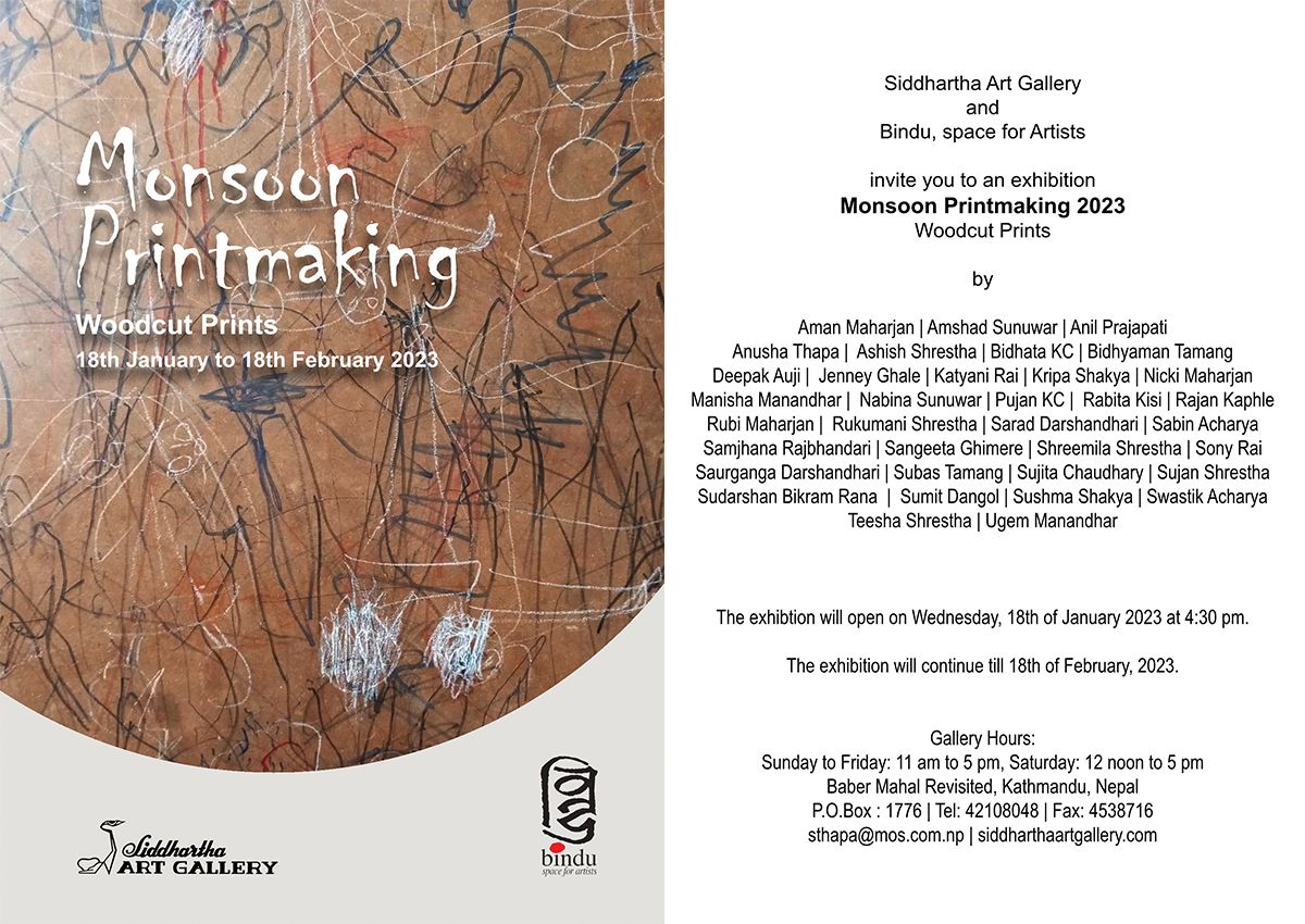 Monsoon Printmaking Exhibition 2023 is the outcome of an online woodcut workshop organized in 2022. The mission of this workshop was to develop and share the relief process of printmaking. Thirty-five artists from multi-disciplinary art backgrounds participated in the workshop, creating a body of unique prints. Bindu had a productive experience hosting these skillful set of printmakers. Bindu believes this iteration of Monsoon Printmaking will play an important role in encouraging printmaking as a medium of expression in Nepali art.
