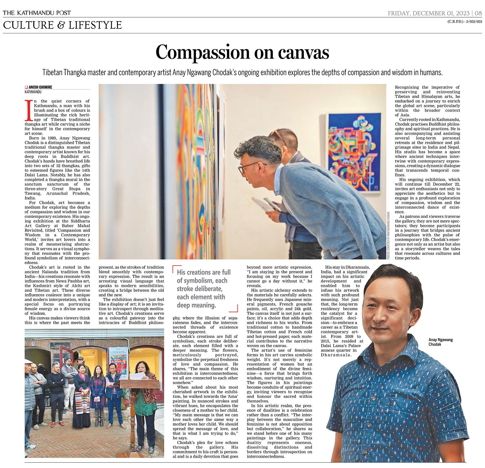 The fusion of styles from Newa Paubha art, Kashmiri style Alchi art, and Tibetan art breathenew life into ancient iconographies, resulting in a visual language that resonates with modern sensibilities. Ngawang’s creations undergo a metamorphosis, merging his deep reverence for tradition with a contemporary interpretation.